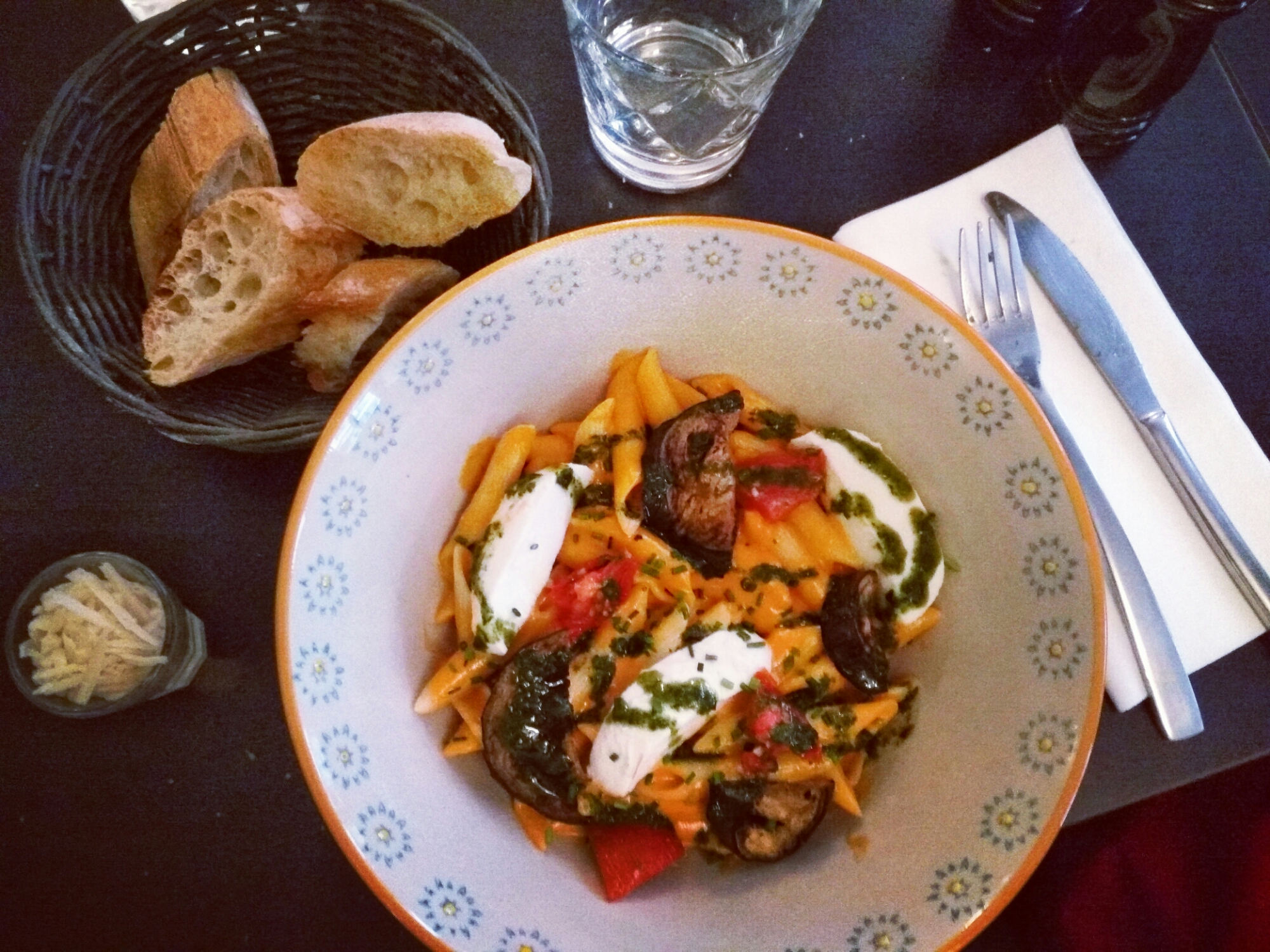 Penne sauce tomate mozzarella, aubergines, tomates, pesto